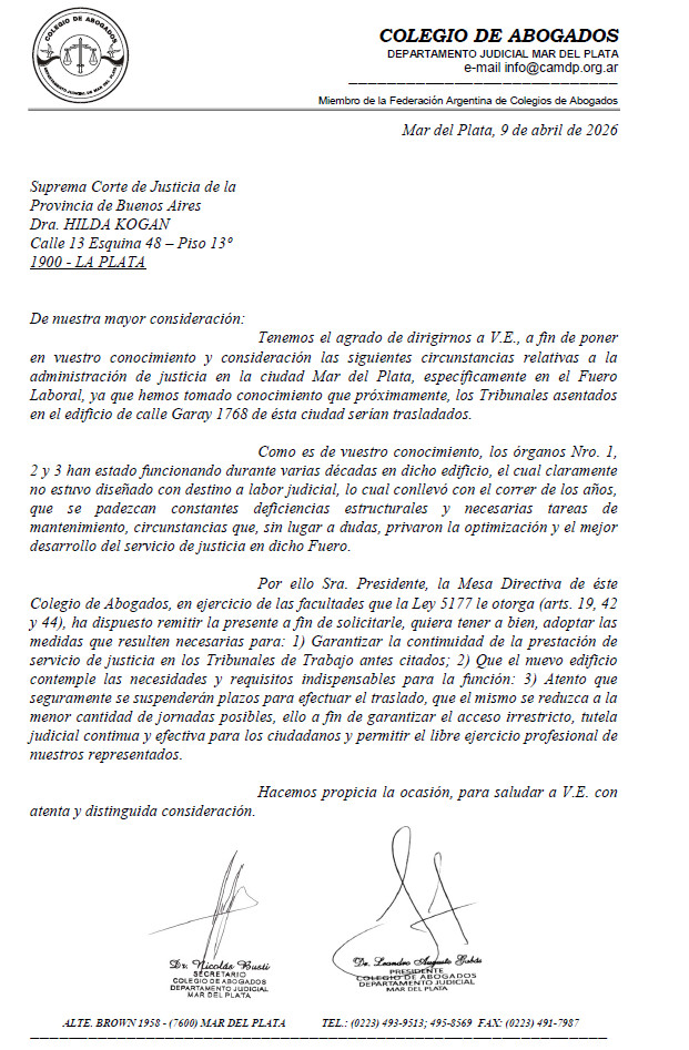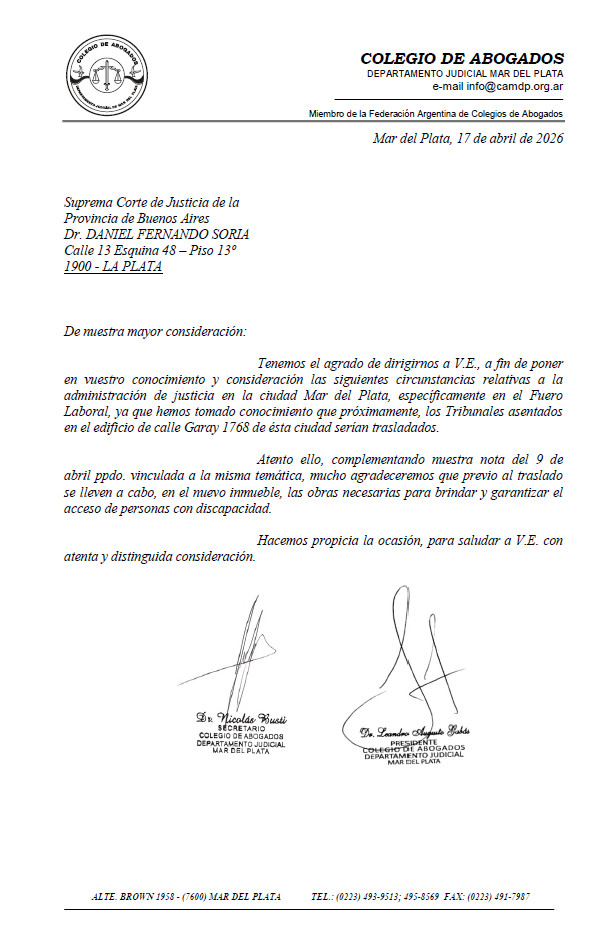 Informamos a los/ colegiados/as que en respuesta a las notas cursadas por el Colegio con fecha 9 y 17 de abril, la Suprema Corte de Justicia el 24 de abril de 2026 remitió la siguiente comunicación: